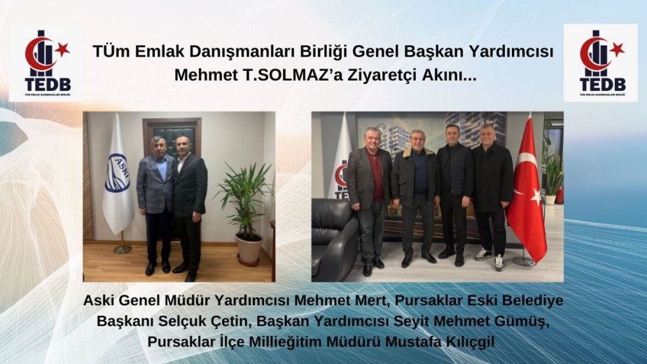 Aski Genel Müdür Yardımcısı Mehmet Mert, Pursaklar Eski Belediye Başkanı Selçuk Çetin, Başkan yardımcısı Seyit Mehmet Gümüş, Pursaklar İlçe Millieğitim Müdürü Mustafa Kılıçgil, Tüm Emlak Danışmanları Birliği Genel Başkan Yardımcısı Mehmet T. Solmaz'ı Ziyaret ettiler.