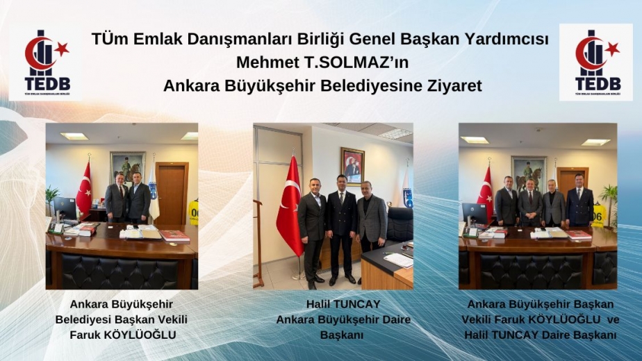 Tüm Emlak Danışmanları Birliği Genel Başkanı Mehmet T.Solmaz Ankara Büyükşehir Belediyesine bir takım ziyaretlerde bulundu. Solmaz, Ankara Büyükşehir Başkan Vekili Faruk köylüoğlu ve Daire Başkanı Halil Tuncay ziyaret etti. Birlik hakkında bilgilendirme yaptı. Çalışmalarında destek istedi. Faruk Köylüoğlu ve Halil Tuncay ziyaretten duyduğu memnuniyeti dile getirdi. Köylüoğlu Mehmet Solmaz'a yeni görevinde başarılar diledi ve bize düşen ne sorumluluklarımız varsa yerine getirmeye hazırız dedi. Solmaz Faruk Köylüoğlu'na ve Halil Tuncay'a emlak, gayrımenkul ve inşaat sektörünün sorunlarını ve çözümlerini sundu. Başkanlara birliğimize yakın ilgiden dolayıda teşekkür etti.