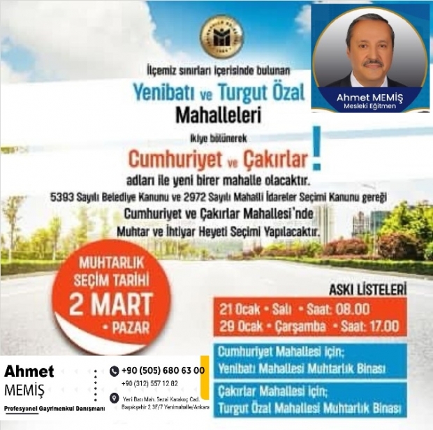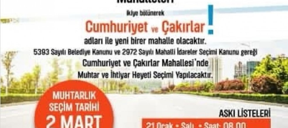 Bölge halkına duyurulur. Yeni kurulan mahalleler için Muhtarlık ve İhtiyar Heyeti üyelikleri aday çalışmaları başladı. Seçim öncesi tanıtımlar yapılıyor.