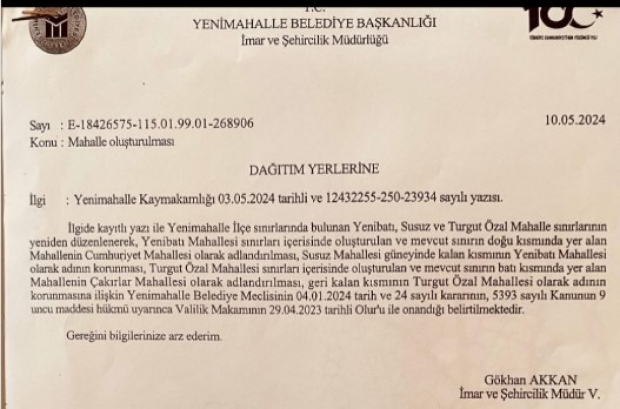 Duyurulan Karar: “Yenibatı, Susuz, Turgut Özal Mahalle Sınırlarının Yeniden Düzenlenmesi, Mevcut Yenibatı Mahallesinin Doğu Kısmı CUMHURİYET MAHALLESİ, Mevcut Turgut Özal Mahallesi Batı Kısmı ÇAKIRLAR MAHALLESİ olarak isimlendirilmesi” şeklinde açıklandı.